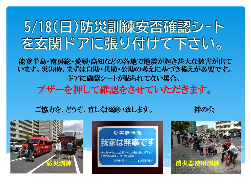 訓練は、震度5強の地震が起きたと想定し、「地震が起きました、火元が安全か確認し、玄関ドアに「我が家は無事です。又は、手助け願います。」のシールを貼って洗車場にお集まり下さい・・・との宅内一斉放送から開始。