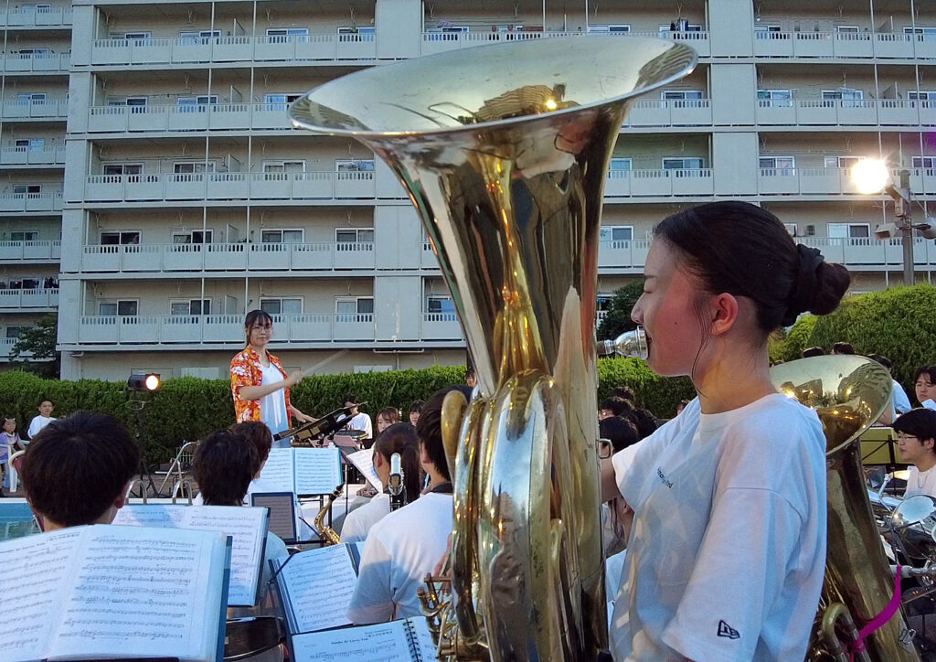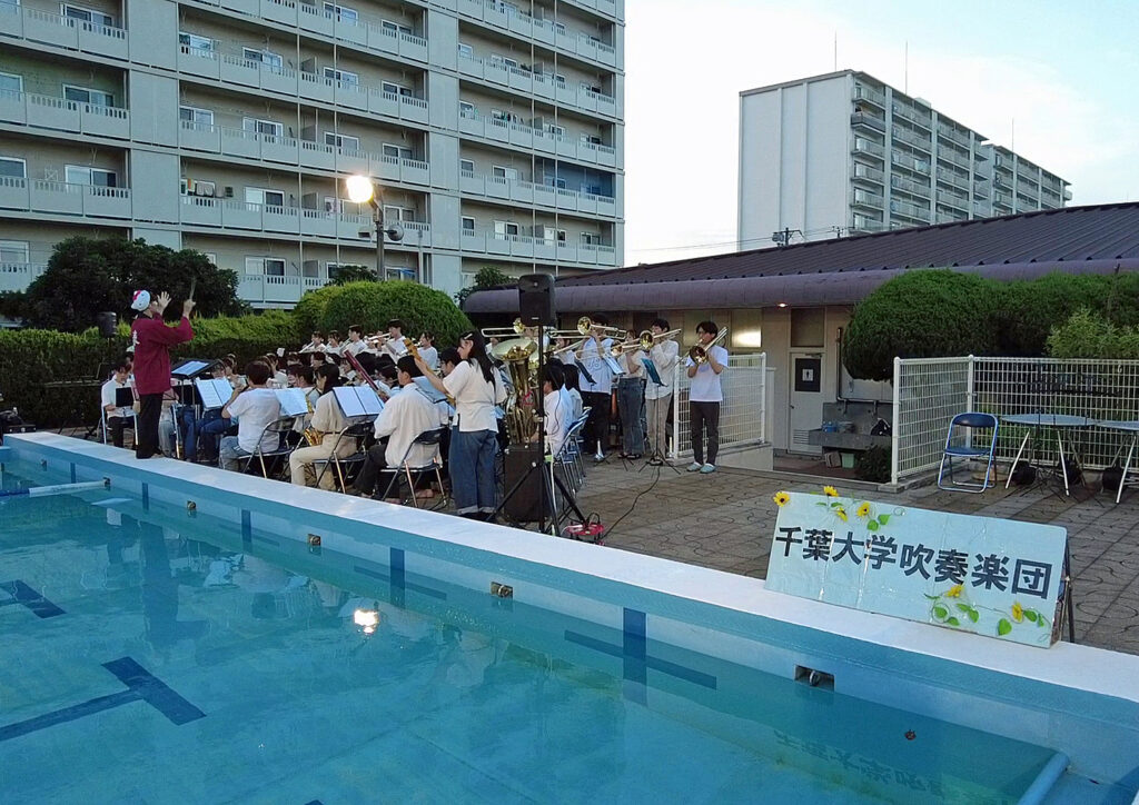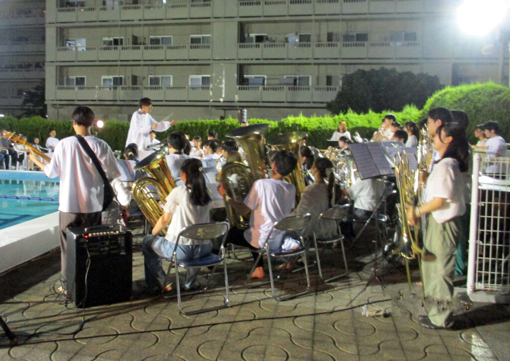 プールサイドには、東建検見川マンションや近隣の住民およそ150人が参加し、千葉大学吹奏楽団員の奏でる演奏曲、「夏祭り」「サンバデラブズユー」「シロクマ」、それに人気アイドルグループ 嵐のメドレ―曲などに聞き入っていました。