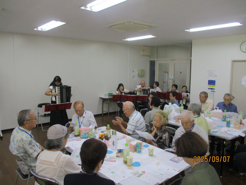 また、会場ではアコーディオン奏者らの演奏や全員での合唱それにビンゴゲームなとが行われ、むすびに、自治会の中村 惠子会長が「参加者の皆さんの益々のご健康とご健勝を」と挨拶、和やかなうちにこの日の敬老会を終えました。