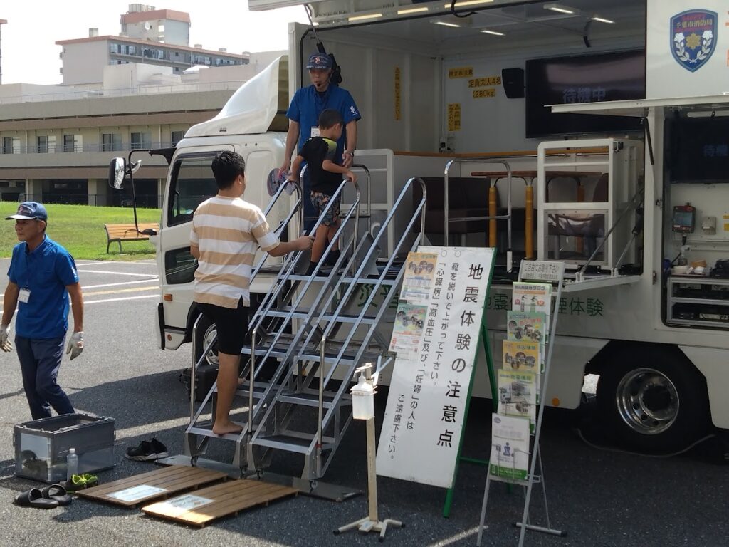 また、体育館入口前には地震を体験できる起震車も来ていただき、貴重な体験もできました。