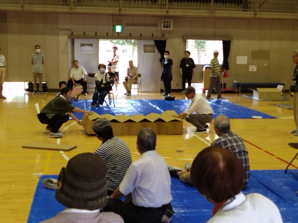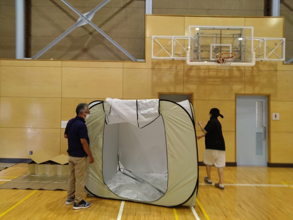 訓練では受付、避難場所の案内、食料の配布、仕切りテント、段ボールベッド、簡易トイレの設営など実施しました。
