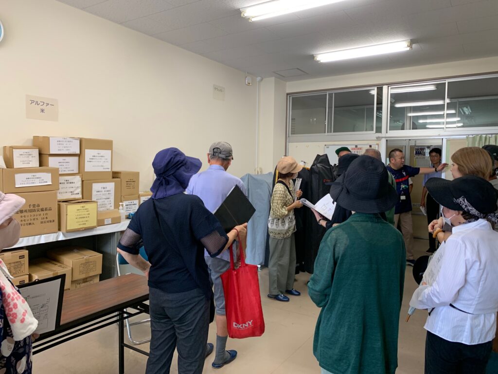避難所開設手順の説明のあと、学校内の備蓄保管場所や校舎内を確認して回り、実際の避難者の模擬受付も体験、最後に体育館のトイレで