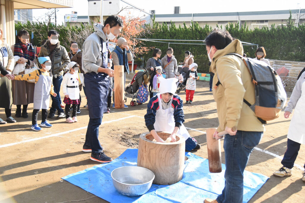 父兄も参加しての餅つき作業