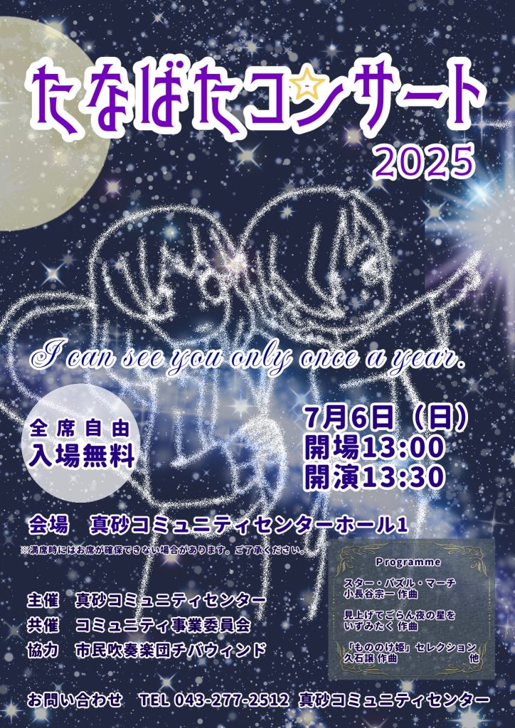 コミュニティたなばたコンサートのお知らせ 2025年5月29日 最終更新日時 : 2025年5月29日 ikusei 🎋すてきな音楽と共にお過ごしください🌌 7月6日(日)真砂コミュニティセンター ホール1にて開催します 市民吹奏楽団チバウィンドのみなさんのすてきな演奏をお楽しみください♬