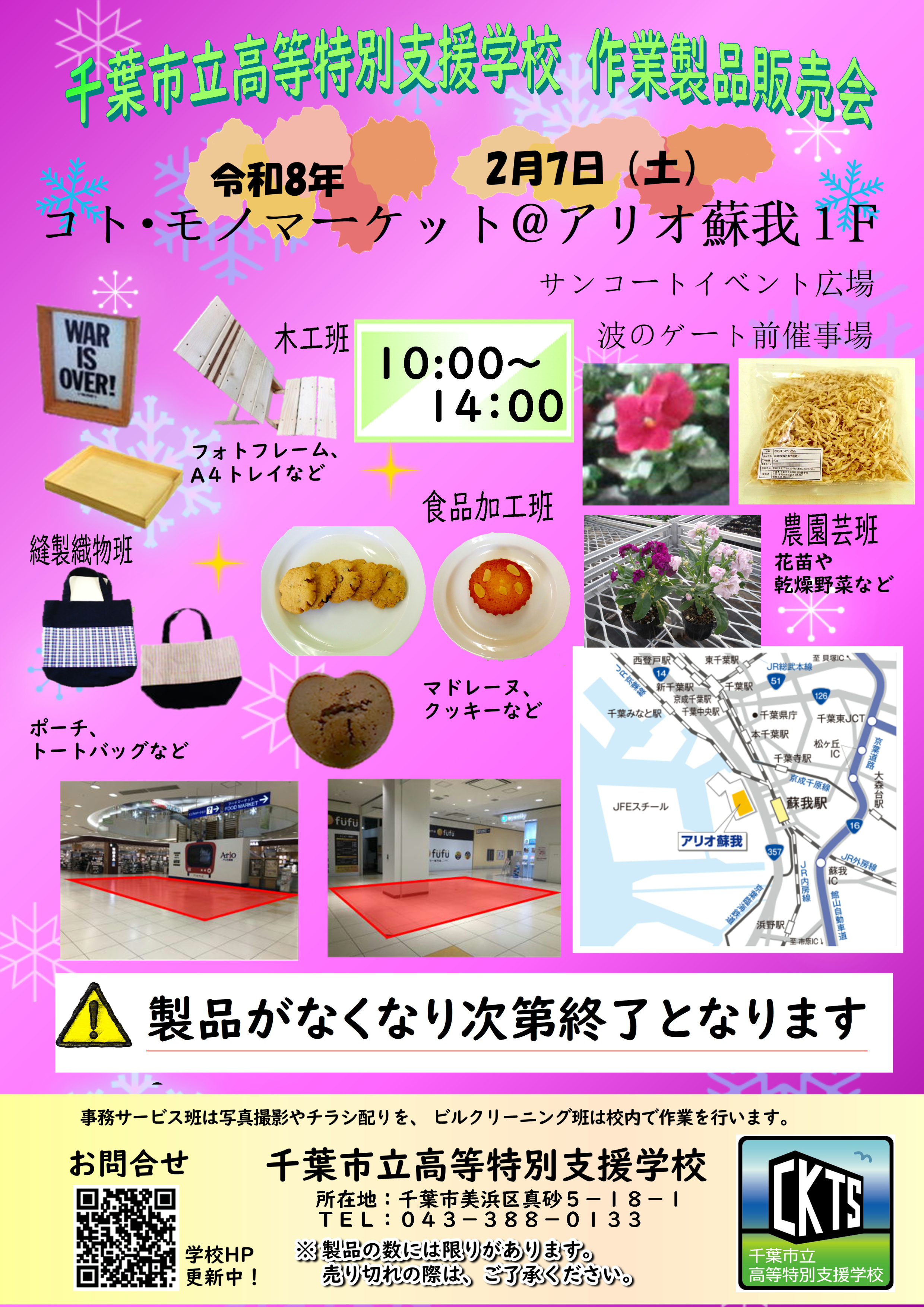 千葉市立高等特別支援学校の「作業製品販売会」が、来月開催されます。!! 2026年1月29日 最終更新日時 : 2026年1月29日 kouhou コトモノダウンロード 千葉市立高等特別支援学校の「作業製品販売会」が、来る2月7日(土)午前10時からコト・モノマーケツト@アリオ蘇我1階のサンコートイベント広場で開催されます。 生徒たちが、丹精こめて製作した作品(製品)が数多く展示され、販売されます。ぜひ、お出かけになってみてはいかがでしょうか。