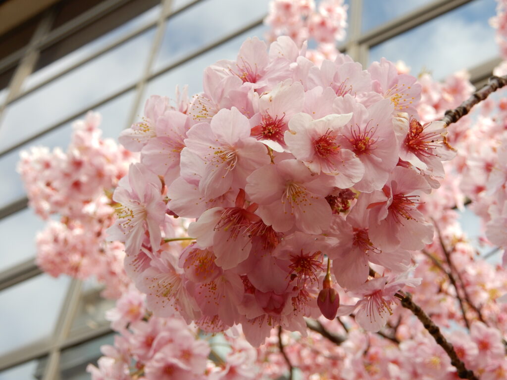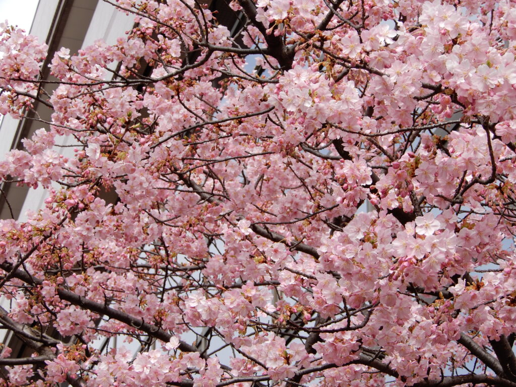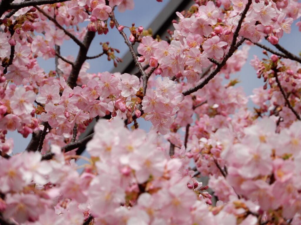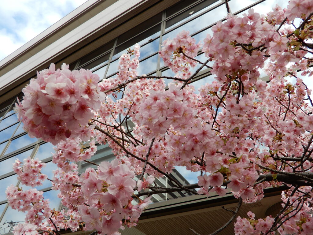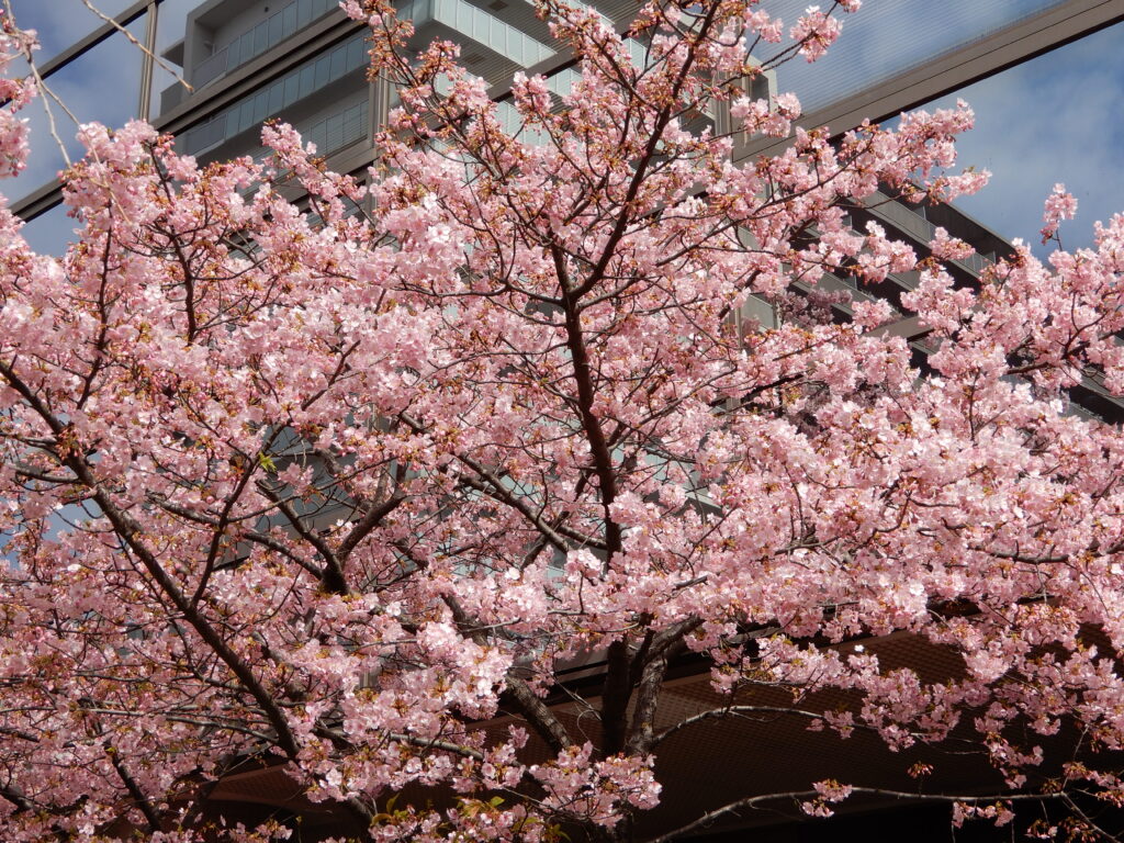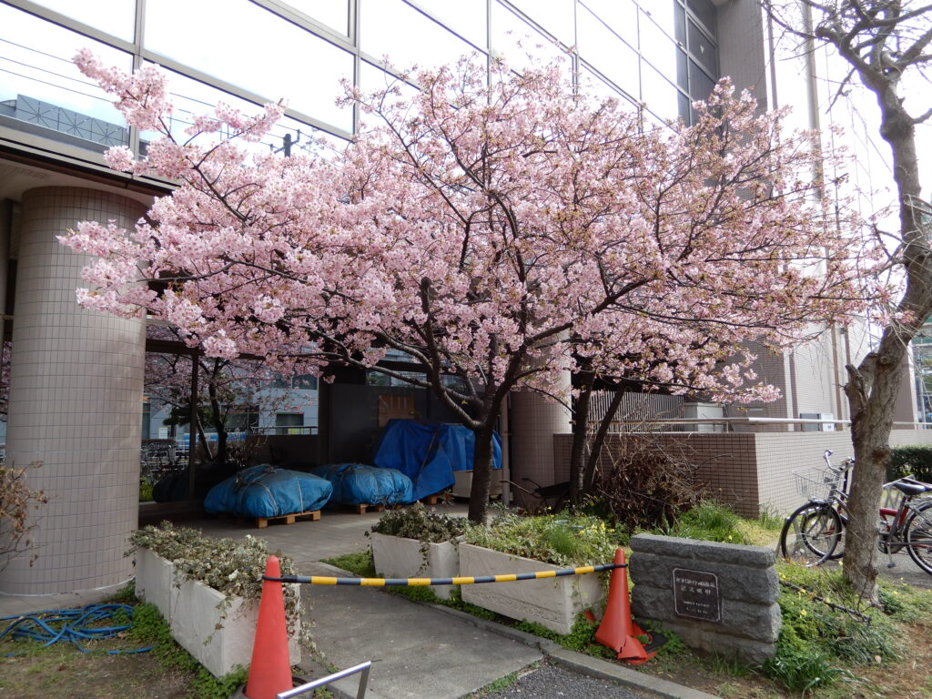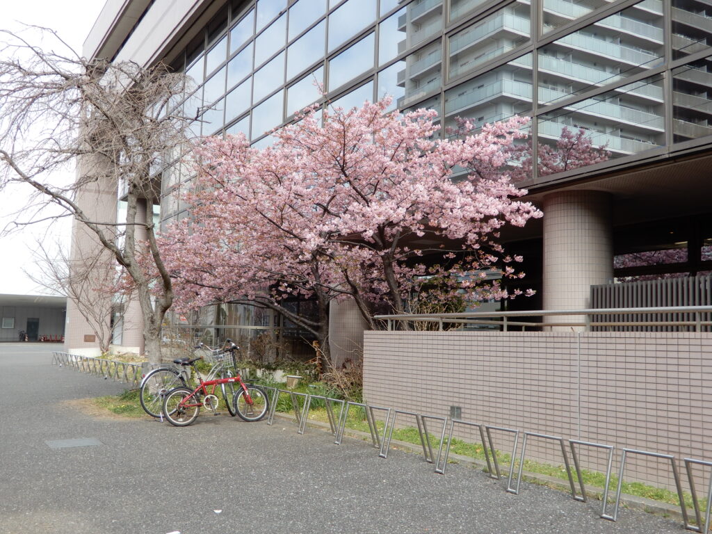 3連休の2月22日(日)、春らしいあたたかい一日になりました。美浜区役所横、自転車置き場の河津桜が満開となつています。