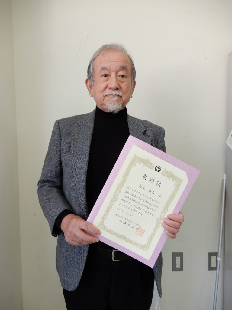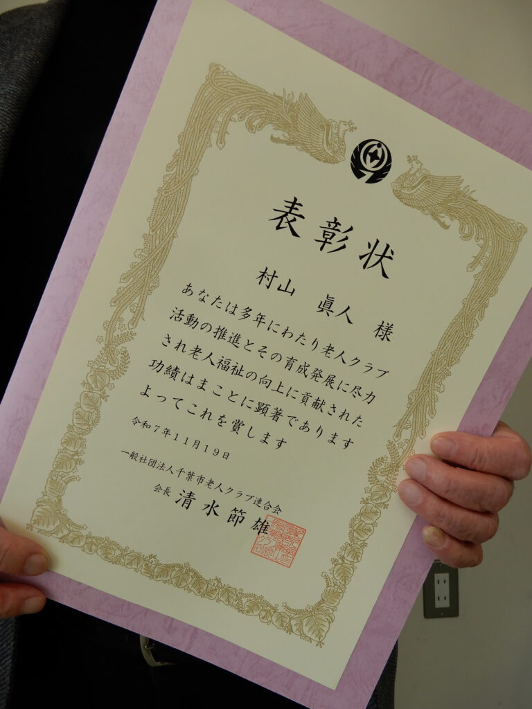 美浜区老人クラブ連合会理事の村山 眞人氏が、このたび、千葉市老人クラブ連合会から会長表彰を受けました。