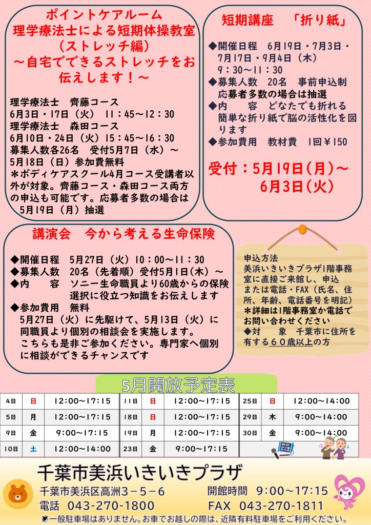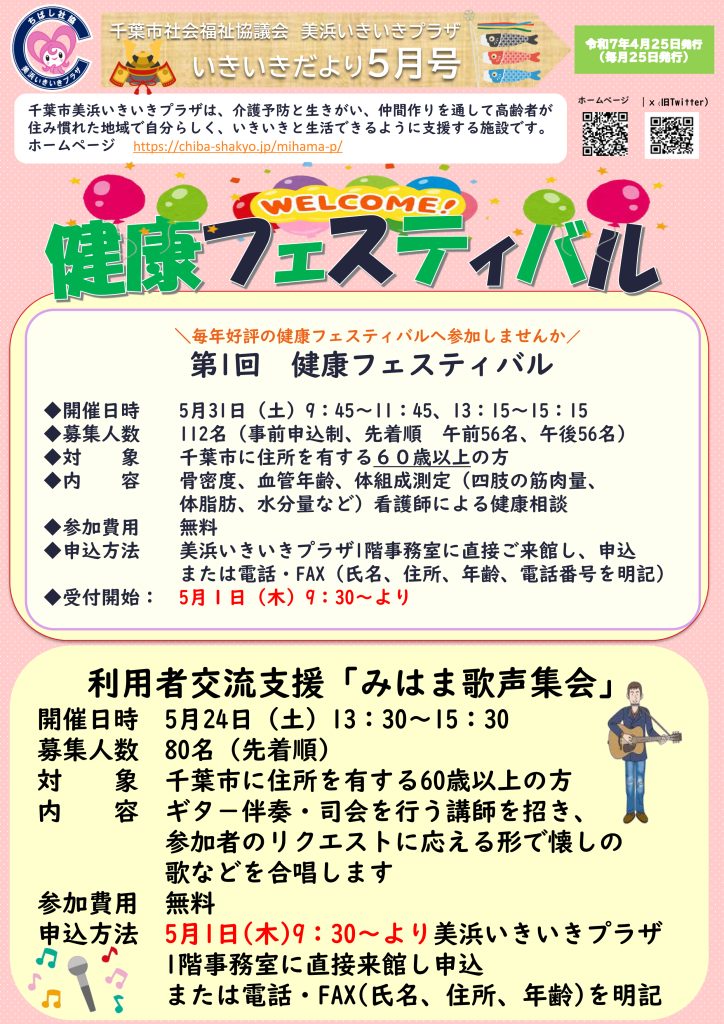 千葉市社会福祉協議会 美浜いきいきプラザ いきいきだより5月号掲載します。 2025年4月25日 最終更新日時 : 2025年5月30日 kouhou 千葉市美浜いきいきプラザは、介護予防と生きがい、仲間づくりを通して高齢者が住み慣れた地域で自分らしく、いきいきと生活できるように支援する施設です。
