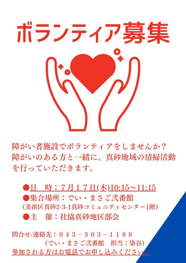 障がいのある方と一緒に真砂地域の清掃活動を行っていただきます。日頃、障がいのある方々が真砂の地域でどのような活動をしているのかを知っていただくことで、障がいのある方への理解を深められればと考えています。 たくさんのご参加、お待ちしております!