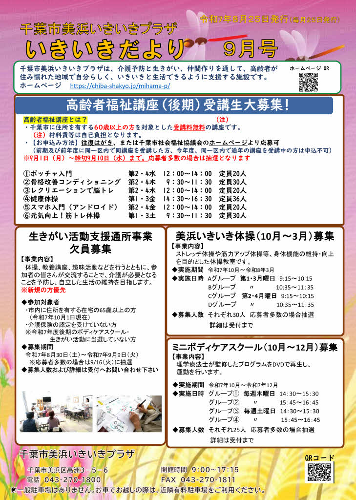 千葉市社会福祉協議会 美浜いきいきプラザ いきいきだより9月号掲載します。 2025年8月27日 最終更新日時 : 2025年10月19日 kouhou 千葉市美浜いきいきプラザは、介護予防と生きがい、仲間づくりを通して高齢者が住み慣れた地域で自分らしく、いきいきと生活できるように支援する施設です。 9月号(美浜)ダウンロード