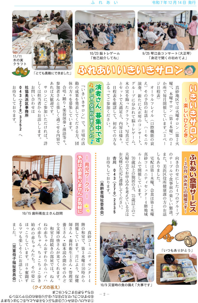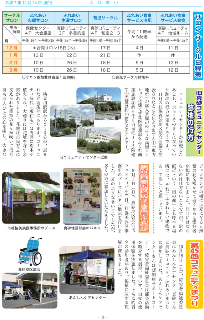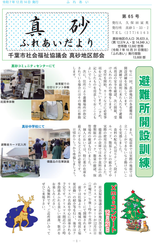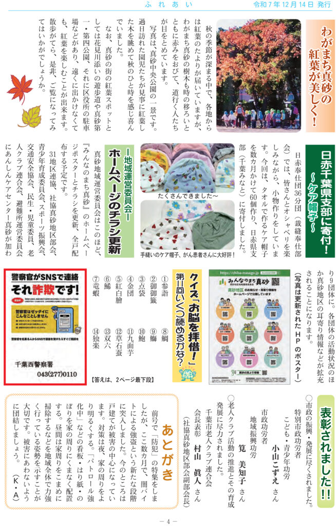 「真砂ふれあいだより」第65号掲載 2025年12月14日 最終更新日時 : 2025年12月14日 kouhou 「真砂ふれあいだより」は、千葉市社会福祉協議会・真砂地区部会が発行する広報誌です。地区の活動やお知らせなどが掲載されています。是非、ご覧下さい。 真砂ふれあい65号1ダウンロード