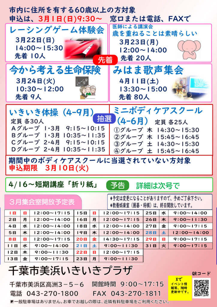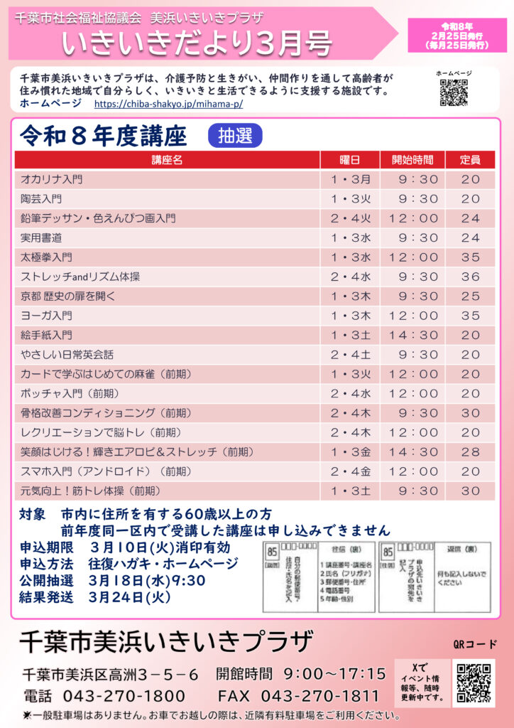 千葉市社会福祉協議会 美浜いきいきプラザ いきいきだより3月号掲載します。 2026年2月25日 最終更新日時 : 2026年2月25日 kouhou 千葉市美浜いきいきプラザは、介護予防と生きがい、仲間づくりを通して高齢者が住み慣れた地域で自分らしく、いきいきと生活できるように支援する施設です。 3月号(美浜いきいきだより) ダウンロード