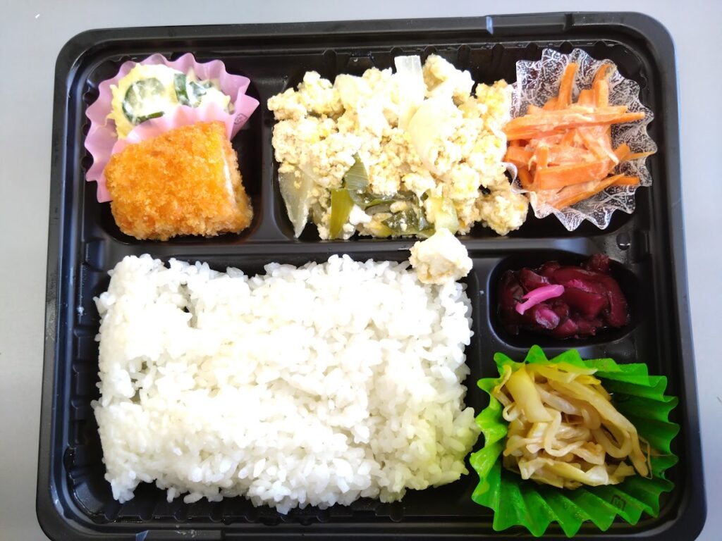 鶏そろぼと豆腐の煎り玉、さつま芋サラダ、ピリ辛もやし、人参シリシリ、イカフライです。